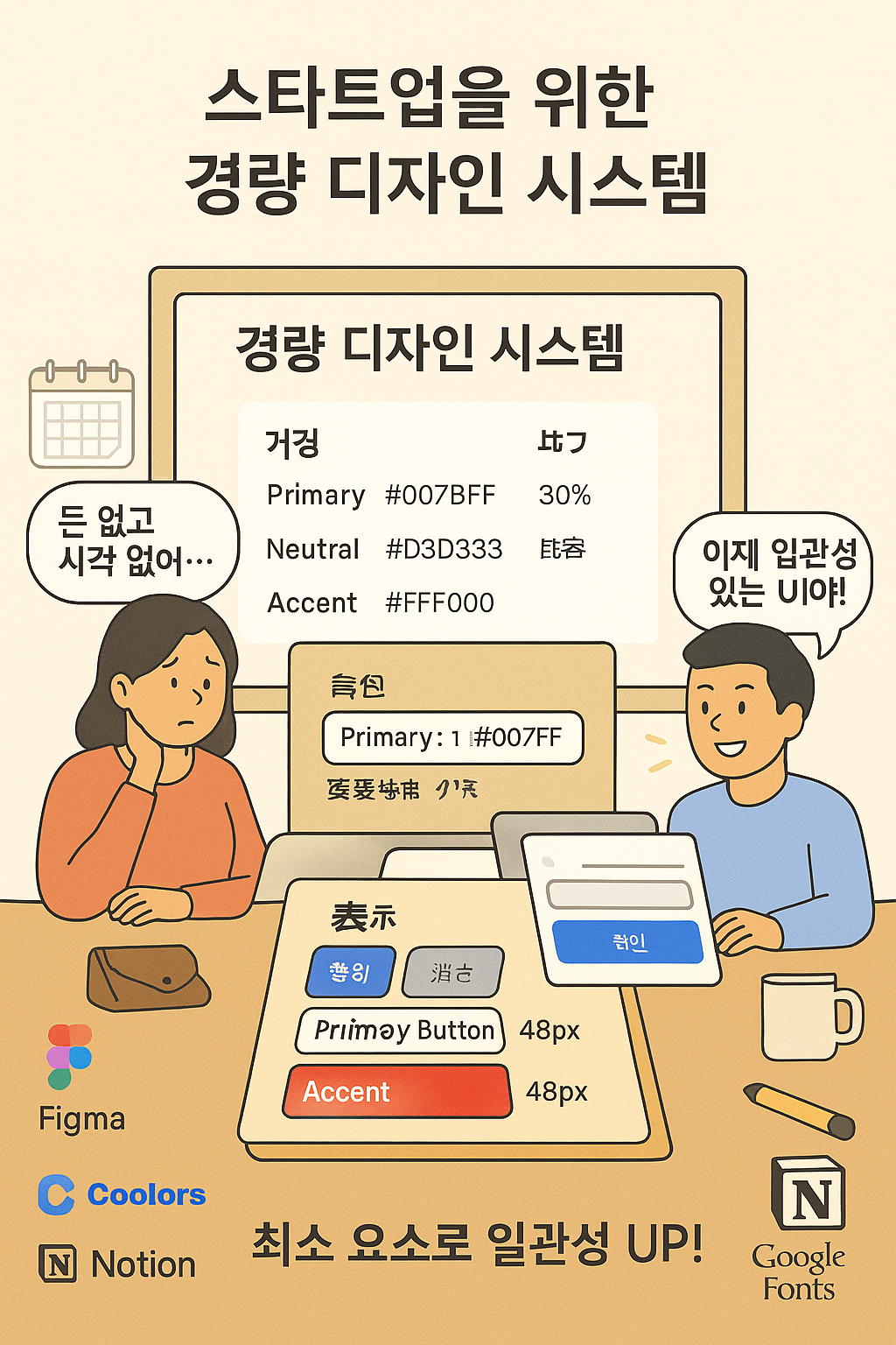 제가 스타트업에서 처음 디자이너로 일했을 때의 일이에요. 회사는 이제 막 시작한 단계라 예산도, 시간도, 인력도 부족했어요. 그래도 제품 UI를 일관성 있게 만들기 위해 디자인 시스템이 필요하다는 걸 알았죠. 하지만 "대기업처럼 거대한 시스템을 만들 시간도 돈도 없는데…" 하며 막막했던 기억이 나요. 팀은 저 포함 3명뿐이었고, 제품 출시까지 한 달도 안 남은 상황이었죠. 게다가 디자인 툴 구독료를 낼 예산도 없어서 무료 툴만 써야 했어요. 처음엔 "이런 상황에서 디자인 시스템을 어떻게 만드나?" 하고 고민했지만, 최소한의 요소로 시작해 보자는 마음으로 도전해 봤어요. 그 결과, 정말 간단한 시스템이지만 팀 작업 효율을 높이는 데 큰 도움이 됐죠. 여러분도 스타트업에서 자원이 부족해서 고민해 본 적 있나요? 오늘은 돈과 시간이 부족한 스타트업을 위한 경량 디자인 시스템을 만드는 방법을 공유해 볼게요!