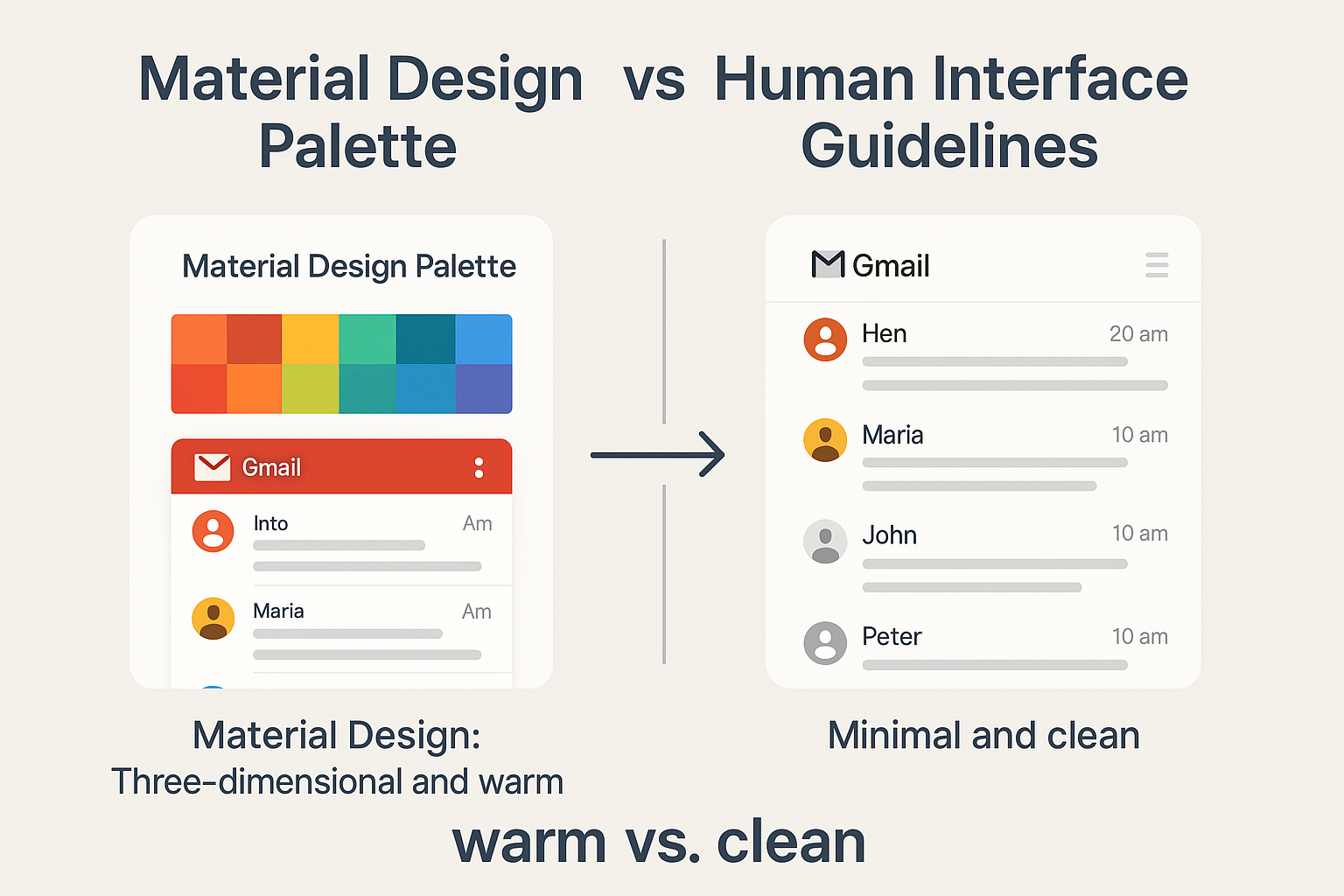 이제 두 시스템을 비교해볼게요. Material Design은 둥근 모서리와 입체적인 요소로 따뜻하고 친근한 느낌을 주지만, HIG는 깔끔한 선과 플랫한 디자인으로 세련되고 미니멀한 느낌을 줘요. 예를 들어, 구글 캘린더의 버튼은 둥글고 그림자가 있지만, 애플 캘린더의 버튼은 더 단순하고 플랫 해요. 또, Material Design은 애니메이션으로 상호작용을 강조하지만, HIG는 애니메이션을 최소화하고 직관적인 레이아웃에 집중하죠.